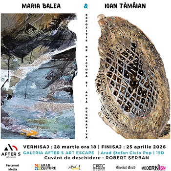 Sâmbătă, 28 martie 2026, de la ora 18:00, Galeria After 5 Art Escape vernisează expoziția de pictură și artă decorativă semnată Maria Balea și Ioan Tămâian.
