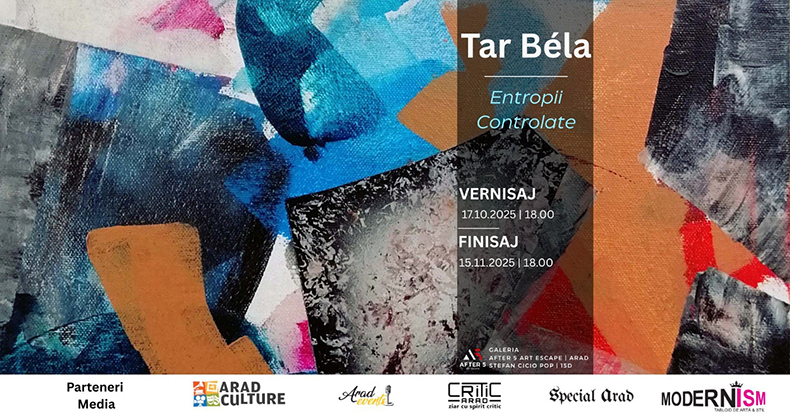 Suntem onorați să vă invităm la vernisajul expoziției „Entropii Controlate”, semnată de Tar Béla, care va avea loc vineri, 17 octombrie 2025, de la ora 18:00, la Galeria After 5 Art Escape din Arad, str. Ștefan Cicio Pop, nr. 15D (colț cu str. M. Eminescu).